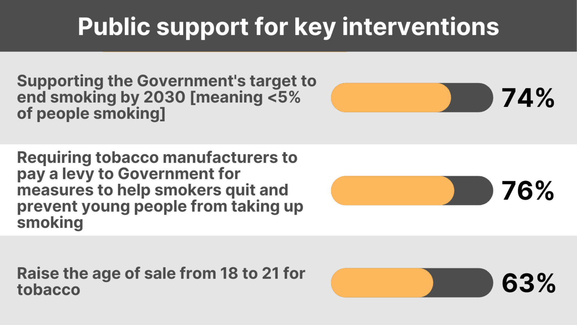 Three quarters (76%) support making tobacco manufacturers pay a levy to fund tobacco control and smoking cessation, 83% support requiring retailers to be licensed to sell tobacco, 70% support increased investment in public education campaigns, 67% support warnings on cigarettes, and 62% support making seating areas outside restaurants, pubs and cafes smokefree. These are all measures recommended by the Khan review.