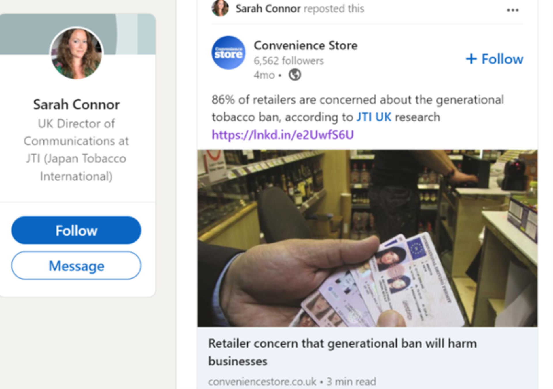 In November you reposted a Convenience Store article quoting research into retailers’ attitudes to the generational ban on sale of tobacco commissioned by JTI.