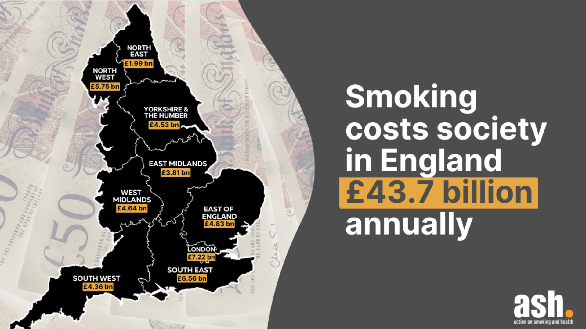 Today, Action on Smoking and Health (ASH) has published new estimates showing that smoking costs society in England £43.7 billion a year – far more than the £6.8 billion raised through tobacco taxes.[1] This includes: