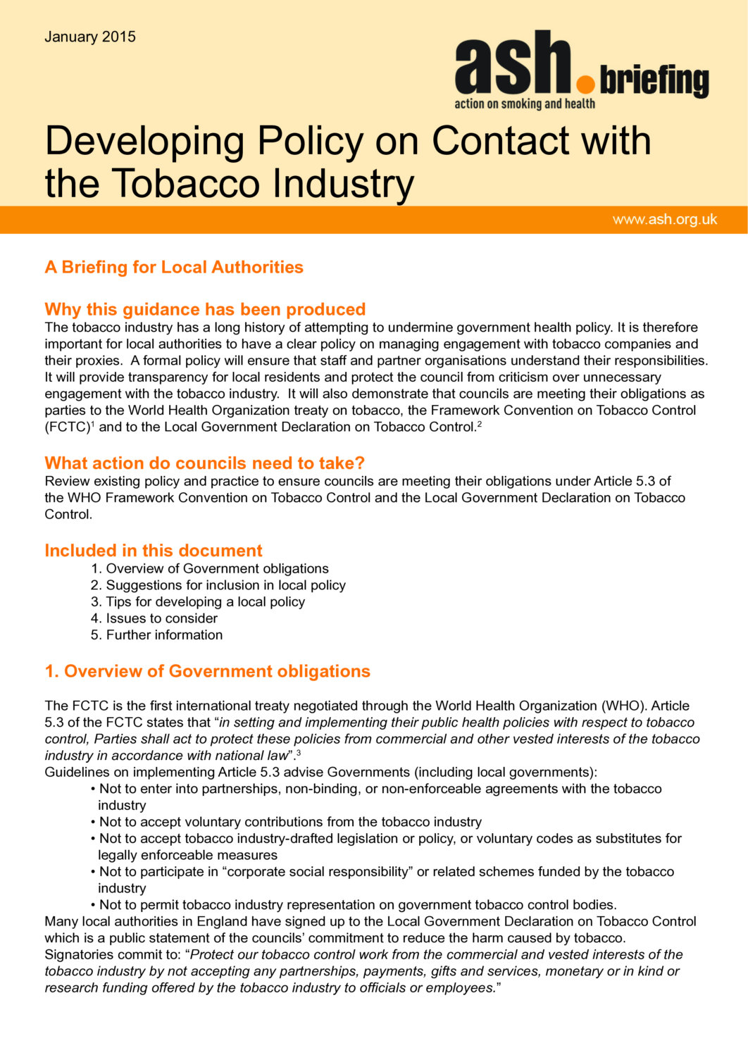 A briefing for Local Authorities to help them meet their obligations as parties to the World Health Organization treaty on tobacco, the Framework Convention on Tobacco Control (FCTC – article 5.3) and to the Local Government Declaration on Tobacco Control.