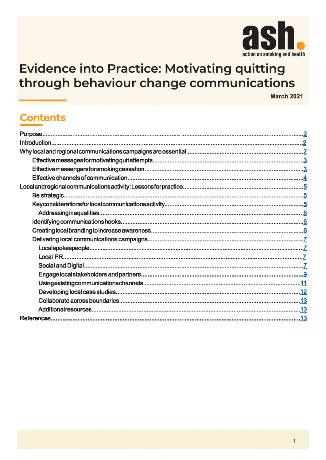 This evidence into practice briefing is a guide for local authorities and NHS organisations about how to use communications to motivate smokers to change their behaviour. It is designed to help localities to embed their communications activity in a broader approach to tobacco control designed to drive down smoking prevalence, with case studies to provide examples of good practice at local and regional level.