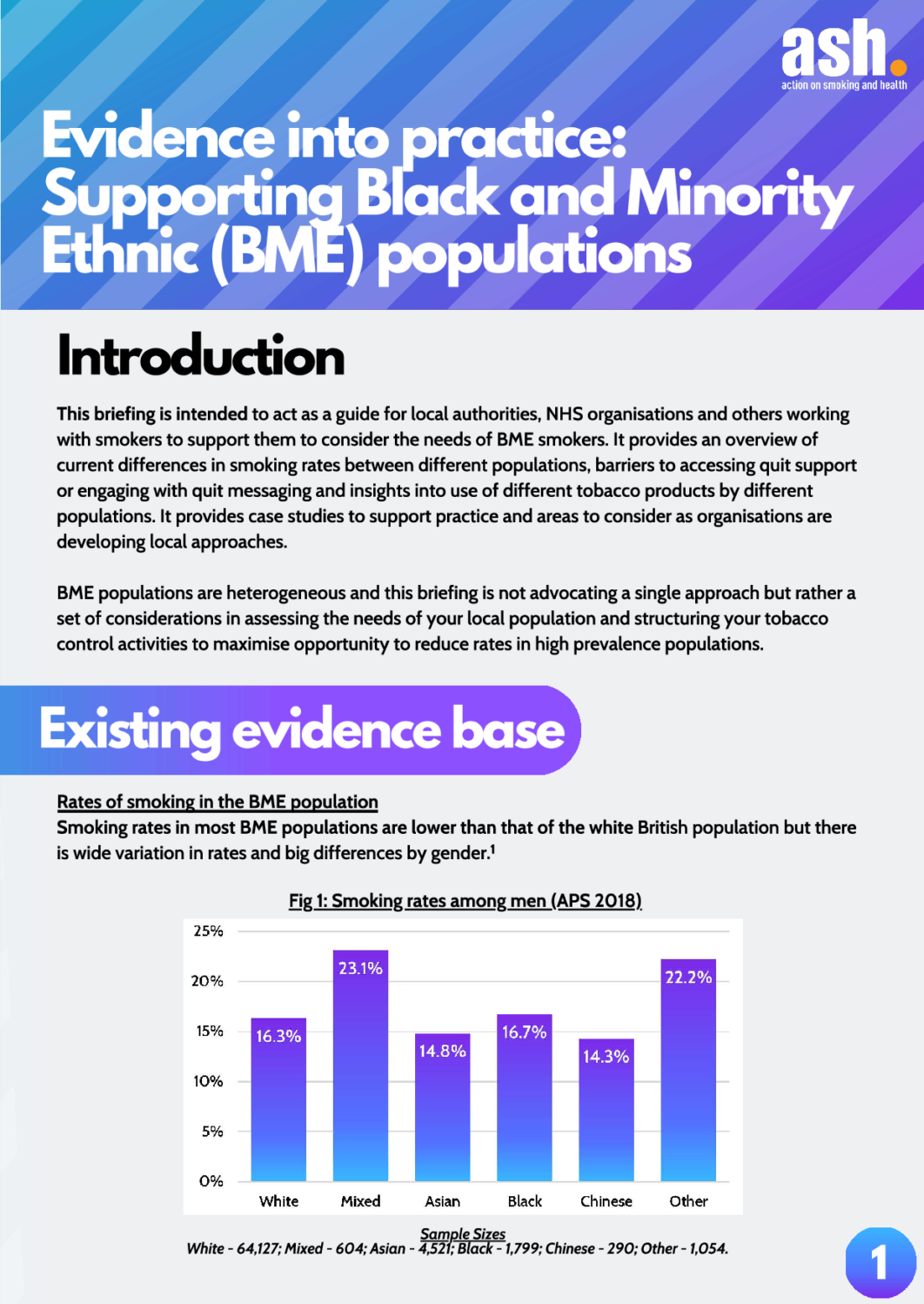 This briefing is intended to act as a guide for local authorities, NHS organisations and others working with smokers to support them to consider the needs of BME smokers. It provides an overview of current differences in smoking rates between different populations, barriers to accessing quit support or engaging with quit messaging and insights into use of different tobacco products by different populations. It provides case studies to support practice and areas to consider as organisations are developing local approaches.