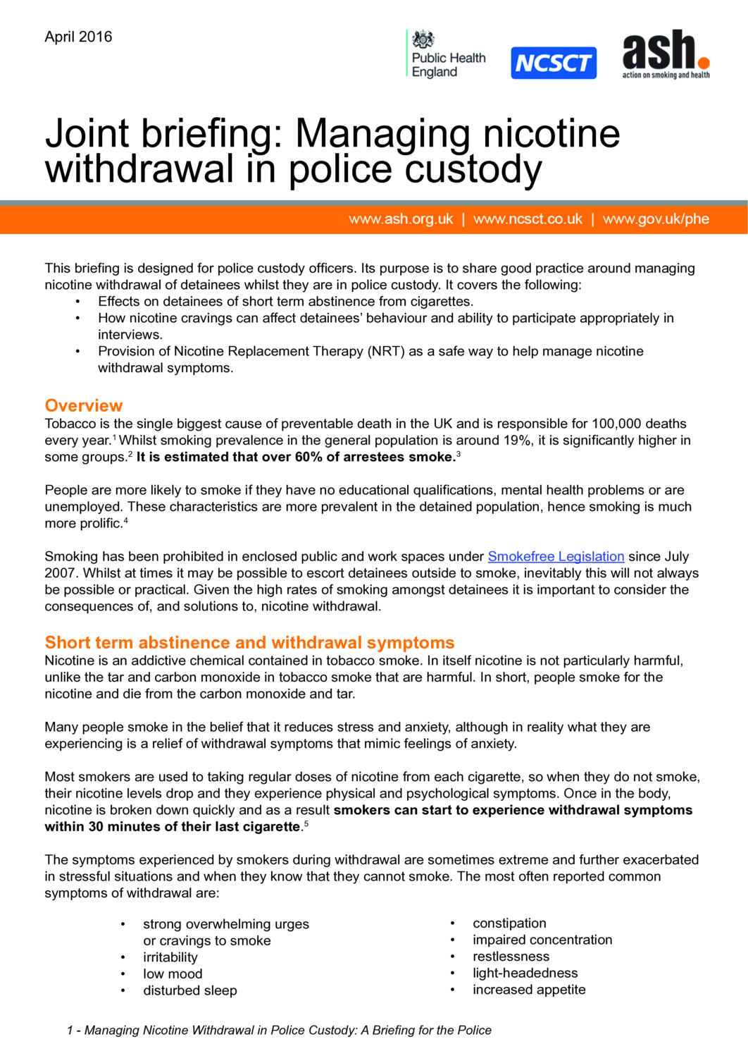 This joint briefing by ASH, NCSCT and PHE is designed for police custody officers. Its purpose is to share good practice around managing nicotine withdrawal of detainees whilst they are in police custody