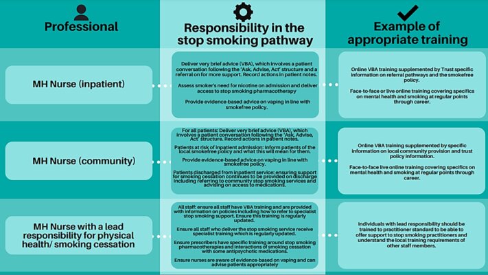 This 2-page training guide for mental health professionals sets out each professional groups’ responsibilities in the stop smoking pathway and examples of appropriate training. The guide includes links to online training resources developed by the National Centre for Smoking Cessation and Training (NCSCT). Professional groups covered in the guide include: