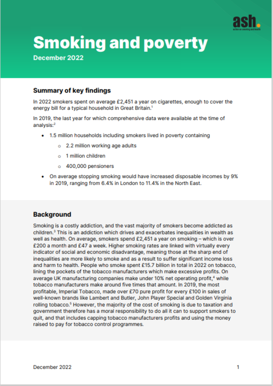 This brief summarises research conducted using data from 2019 to look at the impact of smoking on poverty. It found that 1.5 million households that included a smoker were in poverty. Stopping smoking would have increased disposable income by 9% on average but the proportion varies depending on where people live, with those in the North of England seeing a bigger on average increase than those in the South.