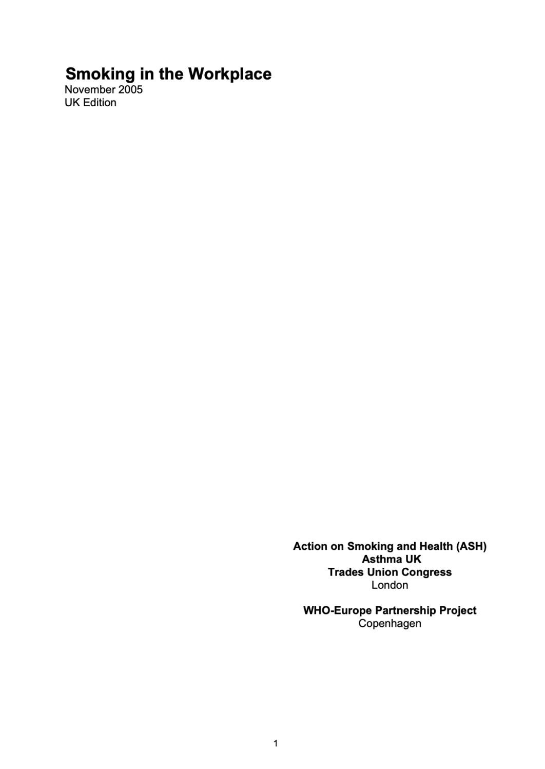 Until new legislation requiring smokefree workplaces is introduced, employers should continue to protect staff by adopting a smoking policy. This report provides guidance and information for employers and employees on existing legal, health and practical aspects of implementing workplace smoking policies.