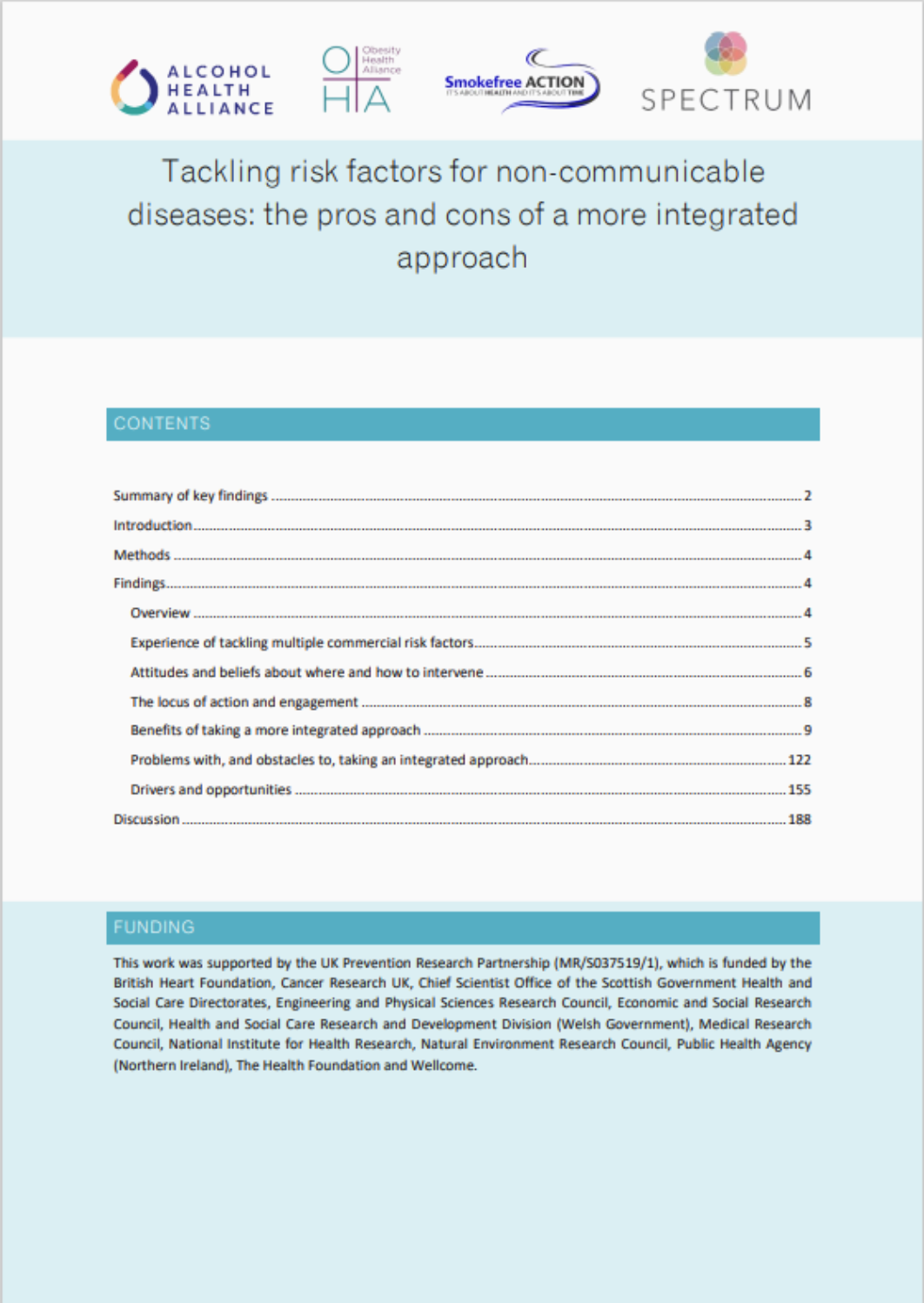 This small study, supported by SPECTRUM and led by the Smokefree Action Coalition, Obesity Health Alliance and Alcohol Health Alliance, explores the scope for government, public health professionals and health advocates to take a more integrated approach to tackling the main risk factors for NCDs. In practice, this can take various forms ranging from greater coordination between partners, through coherence to full integration of campaigning or policy-making. As smoking, drinking and the consumption of unhealthy food and drink all have powerful commercial determinants, there is a case for tackling these determinants in a more joined-up way. It has been argued that the commercial determinants of health are addressed most effectively not through siloed efforts to reduce consumption of health-harming products, but instead as a set of integrated strategies to reduce exposures to health-harming commercial actors and activities.
