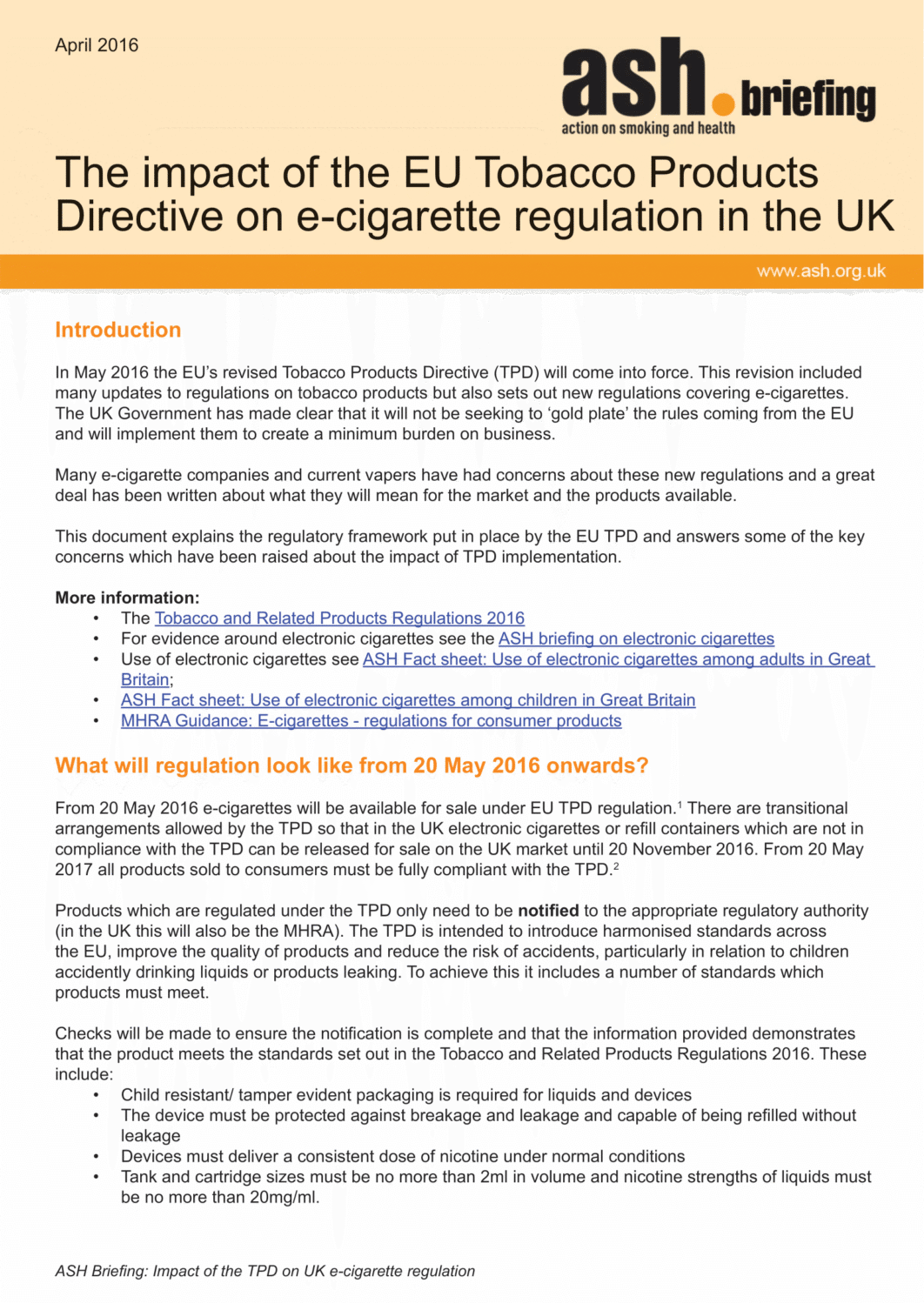 This briefing examines the impact of the EU Tobacco Products Directive on e-cigarette regulation in the UK